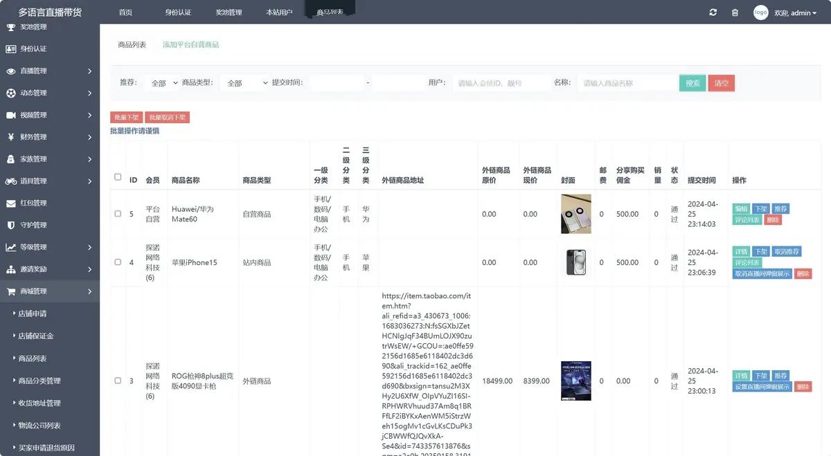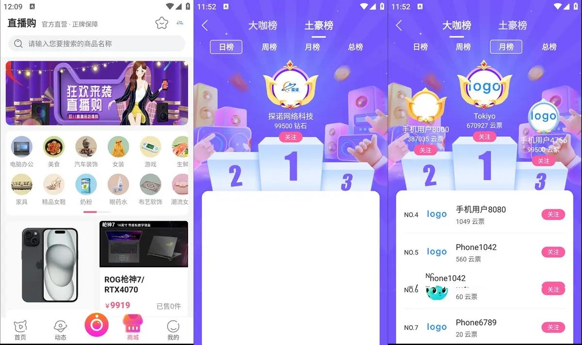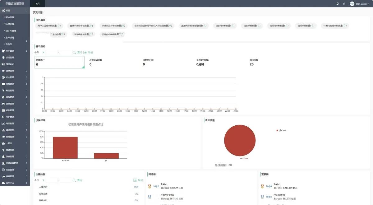 亮点功能简介:直播带货、电商商城、外链商城、短视频带货、小程序带货、商品分销、商品手续费、广告位出租、计时收费/密码/直播间、打赏离谱、双排行榜、主播守护、付费会员、内容付费、财务管理、坐骑系统、公会系统、数据统计、店铺审核、店铺押金等。